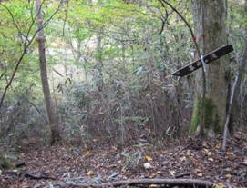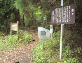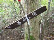 暮雨の滝への分岐 9時23分 登山口から40分。ここから下ると暮雨の滝。 滝の音がゴーゴーと聞こえる。
