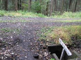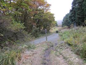 分かれ道 8時05分 真っ直ぐ進むと道の角に小さな標識が出ている。吉部方面が二つあるので、ん?と悩むが、大船林道方面の右に曲がって進む。 向かう「吉部登山口」は、久住で登山をする人には当然のように知られているが、長者原や、牧ノ戸のように、幹線道路に面していないので、一般の方には殆ど知られていない。実を言うと、私も初めて吉部登山口に行くのである。 |