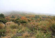 分岐を振り返ってみる 10時24分 色づいた山肌は、霧で近くまでしか見えない。