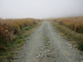 吉部の登山口へ 8時02分 長者原から吉部へ戻ってきた。九重町大字田野の交差点から黒岳方向へ向かうと、道路の両サイドに大きな木の並木道がある。この並木道をまっすぐ進む。この並木道の手前を左に曲がると、黒岳の登山口である男池(おいけ)へと続く。写真でわかるように、先は濃霧で全く見えず、真白である。この中を入山するのには少々勇気がいる。 |