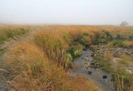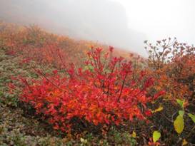 | 天気予報は「晴れ」だったが・・、現地に到着したら濃霧と小雨。 半ば、本日の登山を諦めて、長者原まで様子を伺いに行ってみた。 すると、個人や団体の登山客が、しかも私より年輩の方々がガンガン出発していたので、これは負けてはならないと、 変なスイッチが入ってしまい・・・・・、当初の計画通り、吉部(よしぶ)の登山口に向かった。 残念ながら終日、霧は晴れなかったが、それなりに秋の久住を満喫できた。モミジの「赤」が素晴らしかった。 |