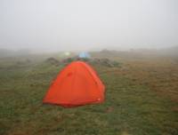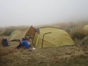 坊ヶツルキャンプ場 10時54分 この天候だが、キャンプ場にはたくさんのテントが設営されていた。さすが、「アッパレ!」