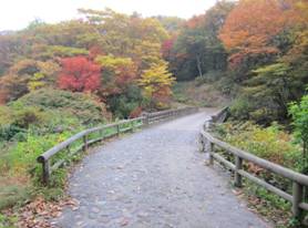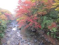 すぐに橋を渡る 15時12分 この辺りの紅葉も「赤に黄色」と素晴らしい。