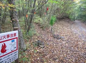 大船林道ショートカットの分岐 15時40分 山火事注意看板のすぐ右に、細い道があった。