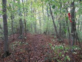 まだ先があった 16時06分 先ほどの分岐に戻り、よく見ると、林道を横切る道が続いていた。木に赤テープがあった。