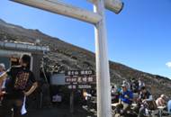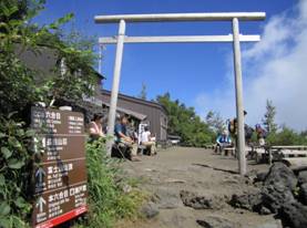 久須志(くすし)神社の鳥居 4時03分 須走口頂上に到着。小屋を出て2時間だった。普通であれば1時間なので、かなりのスローペースだ。頂上の土産物屋さんは大混雑!