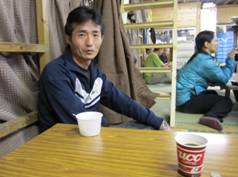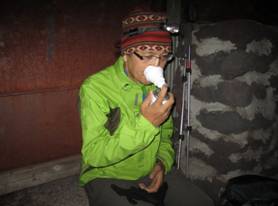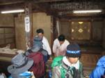 小屋の前で酸素を補給。 4時14分 T師匠は少々気分が悪く、携帯酸素を吸って気分を落ち着かせる。多少の効果はあるようだ。
