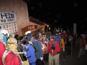 9月5日 2日目登山開始 1時59分 昨夜床に就いたのは夜の8時頃だった。山小屋の説明では1時30分に部屋を点灯するといっていたが、12時頃には団体さんが一斉に支度を初めて、部屋の中が騒がしくなった。結局1時に点灯したと同時に起床し、私たちも支度をした。外に出てみると既に登山者の行列が出来て、下から大勢登ってくる。そして、その行列は頂上まで続いていた。(悲) |