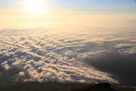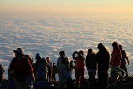 5、お鉢巡り開始 5時23分 御来光を拝むと一斉に人が動き出した。 すぐに下山する人も多い。私たちは計画通り一周3キロのお鉢巡りに挑戦することにした。 朝日がとても強く、眩しい。その光は山頂を赤く染めた。雲海は時間とともに表情を変えていく。色や形がとても面白い。ずっと雲海を見ていると、何故か自分たちが宙に浮いている気分にもなってくる。不思議な世界だ。 |