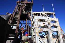 富士山測候所 展望台 6時54分 ここから私たちが登ってきた富士山の反対側を見ることができる。 この測候所は1932年に観測が始まったが、2004年9月に自動観測技術の発達に伴い無人化され、職員の常駐観測を終了し、72年間に亘る有人観測の歴史に幕を下ろした。 |