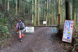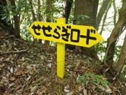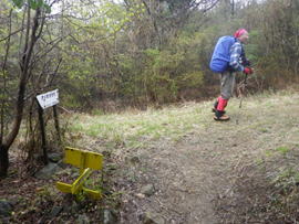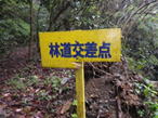 10、金満尾根への分岐 13時37分 足下の黄色い標識から森に入って行く。 金満尾根は英彦山秋の峰入り道である。 分かり易い表示 |