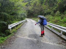 上頂吉3号橋 8時11分 とうとう大粒の雨が降ってきた。ザックにカバーをかけて、風はないので傘を差すことにした。 シャガ真っ盛り |