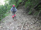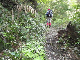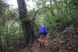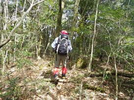 急登のロープに感謝 9時11分 けやき沢で休憩を終え登山道に取り付くが、ここから勾配が増し、おまけに先程までの雨で落ち葉も濡れているのでズルズルと滑って非常に歩き難い。 日頃から奥深い登山道を整備されている方々に頭が下がります。 それにしても誰にも会わないこの登山道、「雪が降り積もった時に一人で黙々と歩くと何とも言えないよ」と言ったH師匠の言葉が忘れられない。 |