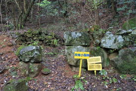 炭焼き小屋跡 9時22分 福智山系に点在する炭焼き小屋。 昔は山のあちこちから煙が立ち昇っていたのだろう。 そんな燻ぶった森の風景を想像してしまう。 石組みが残る |