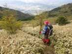 細い登山道を進む 13時45分 落葉の積もる登山道を軽快に下って行く。油断すると濡れた落葉で滑ってしまうので注意だ。 ユズリハ |