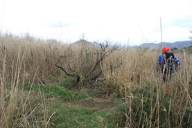 イノシシのヌタ場 14時42分 水たまりが2か所あった。そこはイノシシのお風呂だった。体に着いたダニやシラミを泥水の中で転がりながらこすりとる場所である。 ダニがいるかも? |