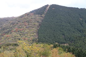 赤牟田の辻の急登に挑む 11時54分 標高差150mの急坂。 一直線に伸びる登山道を必死で上るのだが、上を見上げると気が遠くなる。 焦らずゆっくりペースを守って上ることが大切だ! 右は植林帯、左は自然林で左右の様相が全く異なっている。 |