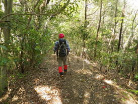 欅(けやき)の大木が残る森を歩く 8時45分 月の平から植林帯を暫く歩くと、ほどなく自然林豊富な森の中へと入って行く。 鳥のさえずりがよく聞こえるようになってきた。 お天気が良くなってきた証拠である。 登山道は落ち葉が幾重にも積み重なりフワフワとしている。時折、落ち葉の上に桜の花びらが散っている。 季節の移り変わりを感じながら歩を進める。 |