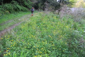 往きの道に出会って右に進む 10時49分 山頂の福智神社上宮前から下り、左周りしながら先程福智山に上ってきた道に戻る格好だ。 こんな道は知らなかった。 赤牟田の辻へ |