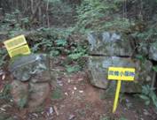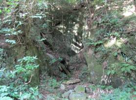 炭焼き小屋跡 8時33分 よくこんなところで炭を焼いていたと思う。 少し広い場所に石垣が積んであった。