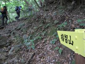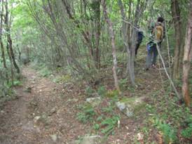 福智平からの下り 11時18分 登山道の途中で右への細い道に入り、樹林帯の中を下って行く。その内、本道に合流する。