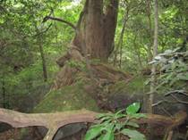 林道を横切り更に登る 8時04分 大きな木の根が岩に巻き付いている。