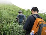 目指す福智山を背に 9時43分 茂った両サイドの笹をかき分けて進む。足元はスパッツをそして、長袖がお勧めです。