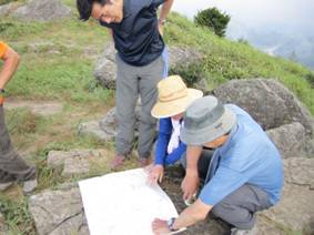 山頂でコース談議 10時47分 時折ガスが晴れる。周囲の山を見ながら、地図を広げてコースの確認をする。