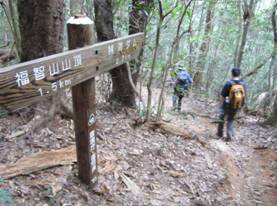 頂吉分れ(かぐめよしわかれ) 9時10分 明るい場所に到着。1年3ヶ月前、皿倉から採銅所まで縦走した時に歩いた思い出の道だ。新しい標識に変わっていた。