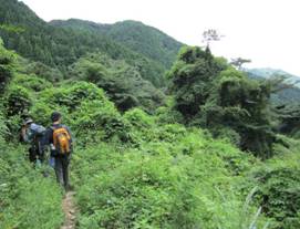 ガレ場を進む 7時43分 ガレ場から樹林帯へ、そして竹林の中へ。