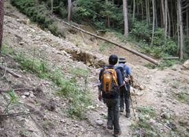 土砂崩れの跡を横断 12時36分 3週間前より崩れている。落石注意!