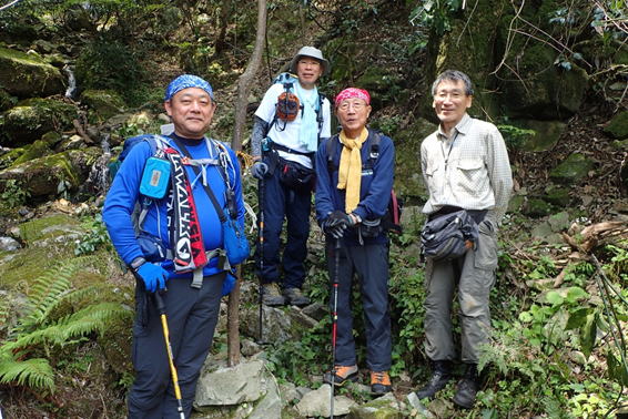 間歇冷泉を下る 12時33分 「熊本地震の直後はこの湧水が1週間ほど濁っていた。」「湧水の記録は1000回以上のデータを集めている。」「そのデータを元に分析すると色々と解ってくる。」等、さすが研究者、その地道な努力に敬服・脱帽である。 F先生とのお話もなかなか尽きないが、記念撮影をして下山することにした。 |