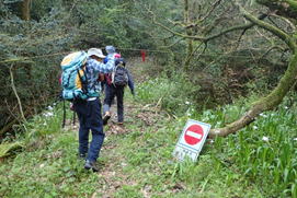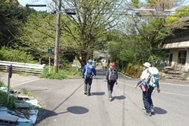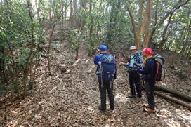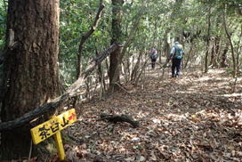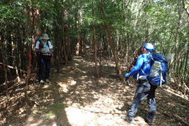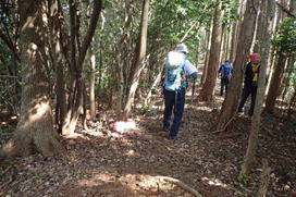 先頭を歩いていたK高さんが、知らずにまたいだのはシマヘビだった。どうやら登山道の日当たりのいい場所を見つけてお昼寝をしていたのだろう。シマヘビもビックリして林の中へスルスルと逃げ込み木登りを始めた。ペロペロと出す舌はなんと気味が悪いことか・・・。 |