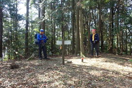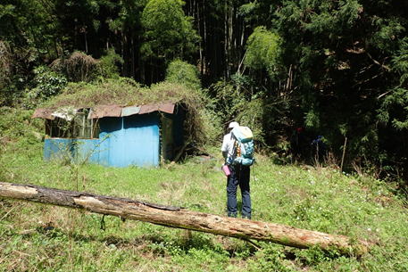| 林道を進んでいくと広場に出た。広場には古びた作業小屋があった。H師匠によると、この小屋は26年程前に建てられたと言う。現在はもう使われていないようだが、当時は林業従事者の方々が作業や休憩に利用していたらしい。 |