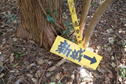 6、満干越 10時52分 新城と茶臼山の山頂を踏んで満干越まで戻って来た。これから本日の主目的である「満干谷間歇冷泉」に向かうことにした。 「かぐめよし」の黄色の標識に従い、歩いてきた道を戻り、すぐ下の林道分岐まで下って行く。林道(白いビニール袋がぶら下がった分岐)に出ると左に進む。 白いビニール袋のぶら下がった分岐 |