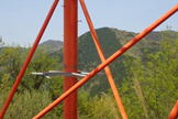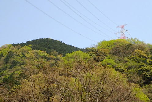 | 右を見上げると今朝歩いた紅白の鉄塔が見える。13時31分 鉄塔の左の山は茶臼山だろう。 |