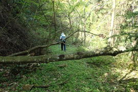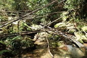 | 何度か渡渉を繰り返して林道を進んで行く 8時15分 倒木などで荒れている |