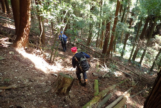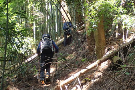 | 二つ目の沢を渡渉した後は、急斜面をトラバースすることになる。徐々に高度を上げ、左を見下ろすとちょっと怖い。ズルズルと滑って歩き難い場所もあり、慎重に歩を進め上って行く。 |
