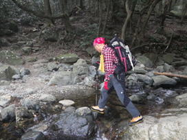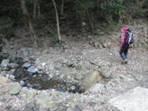 川に沿ってガレ場を上る 8時54分 今日は気温が高い。それに加えて上り一辺倒の登山道を30分も歩いていると、気が付くと帽子のひさしからポタポタと汗が落ちていた。 このコースを上る途中のガレ場や急登は危険を感じる場所が所々出てくる。 雨など降ると当然それ以上に危険度は増すに違いない。中級者以上と言われるこの登山道の所以が徐々にわかってきた。 |