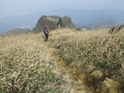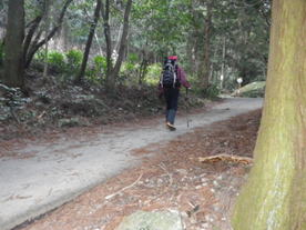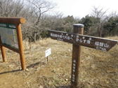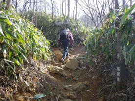 山頂まで最後の上り 9時44分 眩しい太陽に向かって山頂に向かう。お天気は上々だが、残念なことに黄砂が飛来して下界は霞んでよく見えない。風は強い。 鳥野神社上宮 |