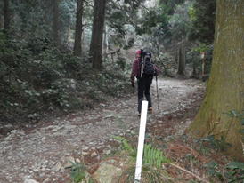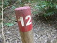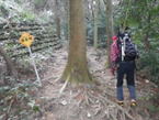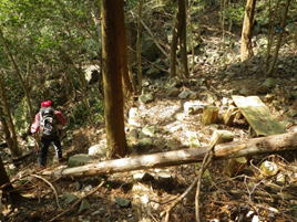 倒木を跨いで進む 12時56分 先程の分岐からは道が更に難路となった。斜面は崩壊気味で危険な道が出てくる。コース上には赤と黄色の番号のついた杭も出てくる。当初は綺麗に整備されていたのだろう。 |