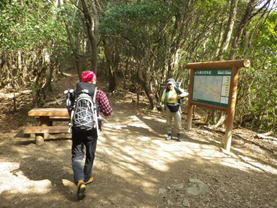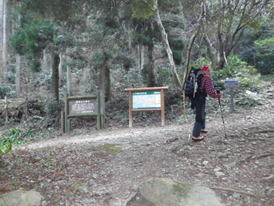 左のルートで山頂を目指す 9時35分 先程の分岐から3分程進むと九州自然歩道の説明版に行き当たる。道はT字路になっていて左右どちらの道でも山頂に通じている。 左に進んだ |