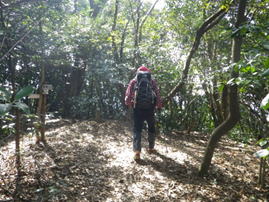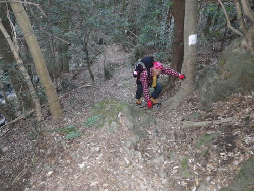 荒れた登山道を下る 12時27分 三叉路からの登山道もあまり人が歩いてない様子で、踏み跡も薄い。しっかりと赤テープを辿って歩く。下り坂の勾配は急で滑りやすい。油断をすると転倒してしまいそうだった。 登山道の整備もそれほどされていなく、倒木を越えて歩く場面も出てくる。荒れた道に苦労しながらも、H師匠のリードでペース良く淡々と下山していった。初めて歩く人は用心だ! |