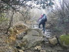 大岩の陰で休憩 9時57分 大岩の陰で風を避けて休憩。身体が冷えるので10分程度休んだ後、先に進むことにした。 福智山下山 |