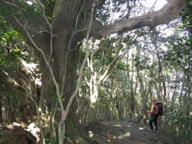 大きなイチイガシの木 11時24分 突然大きな木が目の前に現れた。雲取山の主かもしれない。これより一旦鞍部に下るが、その後はロープが張られた急登を一気に上る。 急登に喘ぐ |