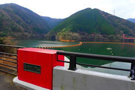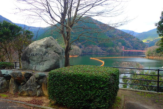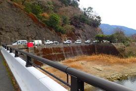 鱒渕ダム建設記念碑前の路肩に駐車 8時10分 遠くに赤い「ます渕橋」が見える