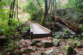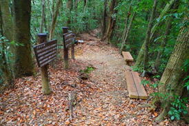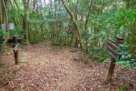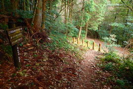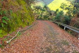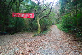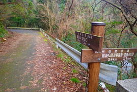 10、登山口(九州自然歩道) 12時54分 登山口に到着。右に進んで、ます渕橋を目指して周回道路を歩く。 充実感に浸る |