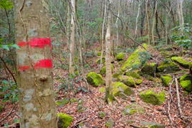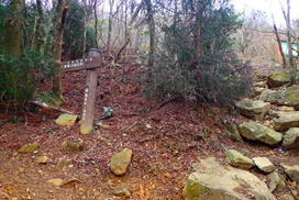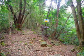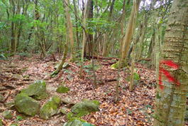 3、ホッテ谷分れ 9時18分 メインルートである九州自然歩道は左だが、今回は右のホッテ谷新道へ進む。 小休憩して右へ |