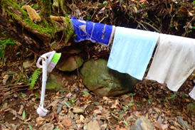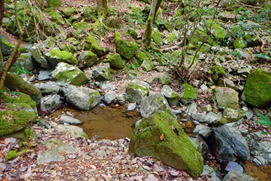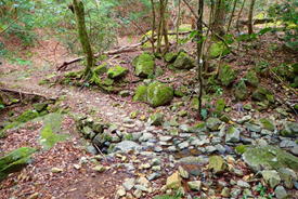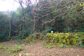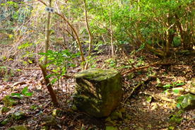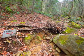 ホッテ平 9時49分 明るい場所に飛び出した!ここは炭焼き跡の石組みが残るホッテ平だ。 石組みの上に |