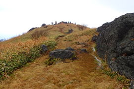 ガレ場に入る 12時20分 ここから左に下るのだが、少し急なガレ場となる。疲れが出ている下山時は要注意! あと3.2km |